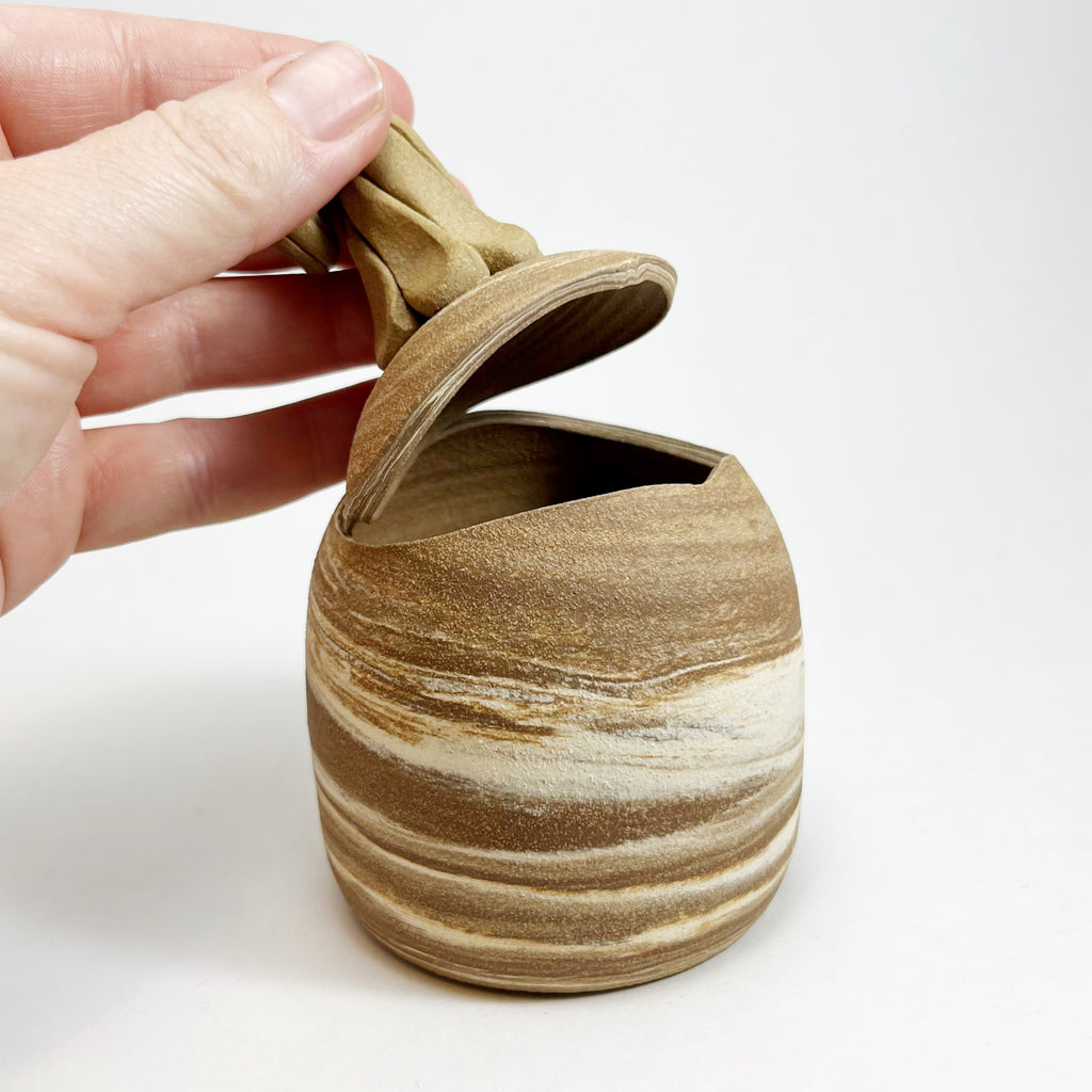 This piece is made using recycled clay. I save all my scraps and through a process called reclaiming, I turn them back into usable clay. For these pieces, I stopped the mixing process a little early so that the beautiful variations in the different clay bodies I use could all shine through on one piece.