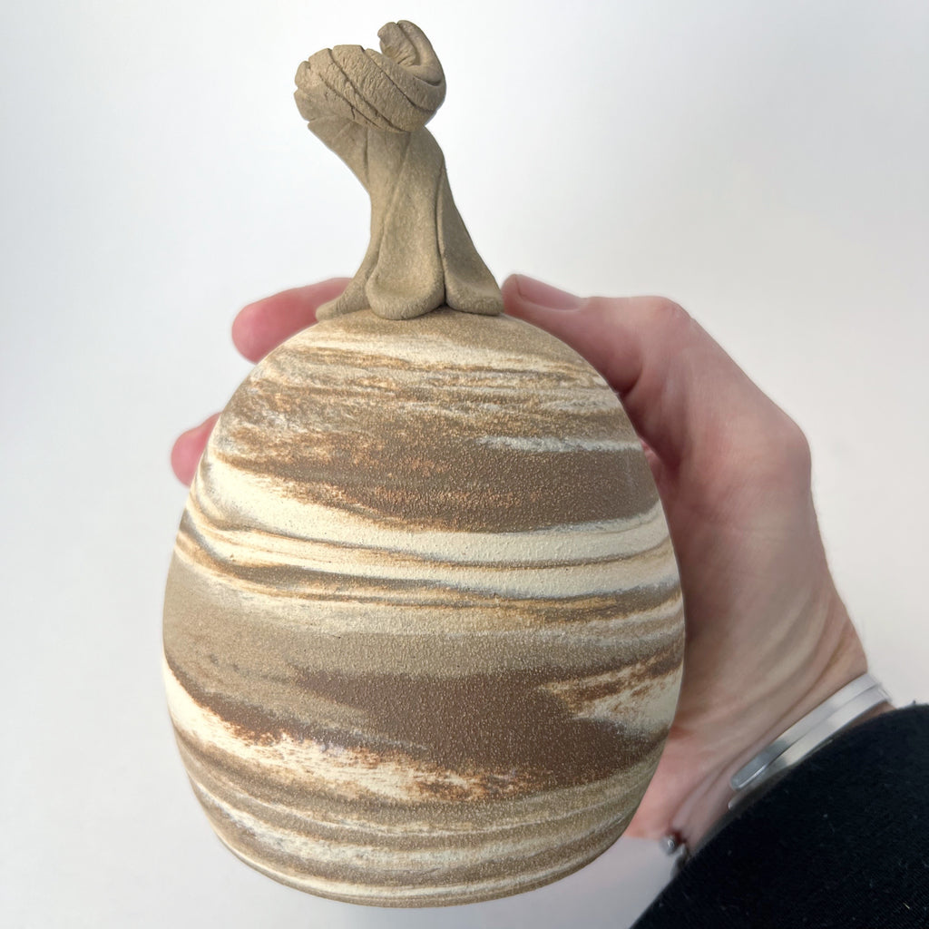 This piece is made using recycled clay. I save all my scraps and through a process called reclaiming, I turn them back into usable clay. For these pieces, I stopped the mixing process a little early so that the beautiful variations in the different clay bodies I use could all shine through on one piece.